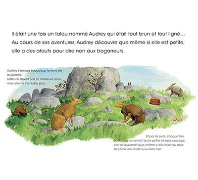 Il était une fois un tatou nommé Audrey qui était tout brun et tout ligné... Au cours de ses aventures, Audrey découvre que même si elle est petite, elle a des atouts pour dire non aux bagarreurs.